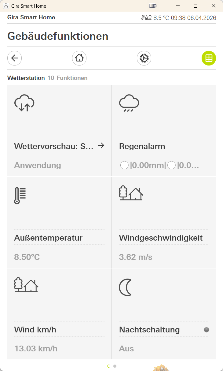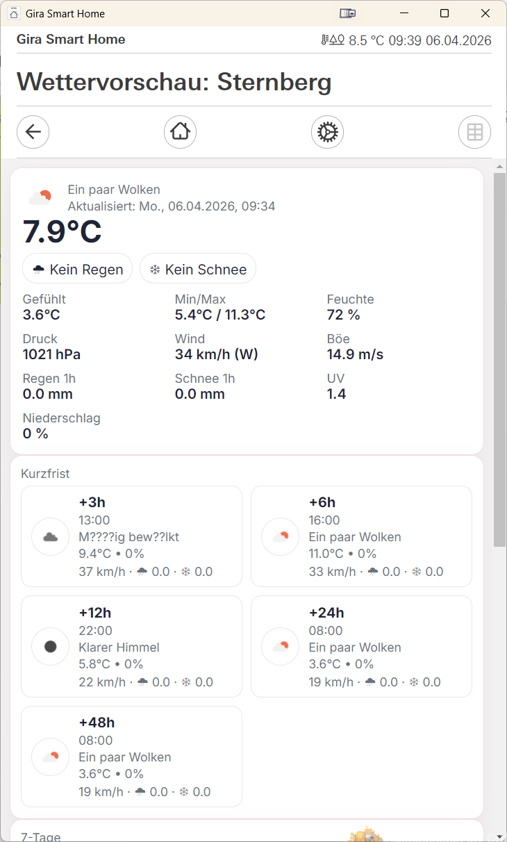 WetterStation verbindet Ihren Gira X1 mit OpenWeatherMap, dem weltweit führenden Wetterdatendienst. Sie erhalten damit Daten, die sonst nur professionellen Wetterstationen vorbehalten sind — und das in Echtzeit, für Ihren genauen Standort, für die nächsten 7 Tage.