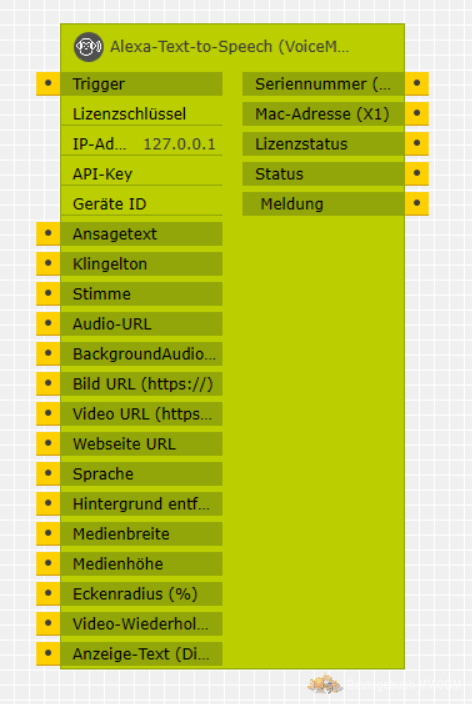 Mit diesem X1-Logikbaustein können Sie über die Voice Monkey APIs Sprachansagen, Medien und Routinen auf Alexa-Geräten auslösen. Der Baustein unterstützt sowohl die klassische API v1 (Trigger) als auch die neue API v2 (Announcement). Je nach gewählter Version blendet der Baustein nur die jeweils verfügbaren Eingänge ein. Hinweis: Für viele Funktionen ist ein Voice Monkey PRO-Account erforderlich. |